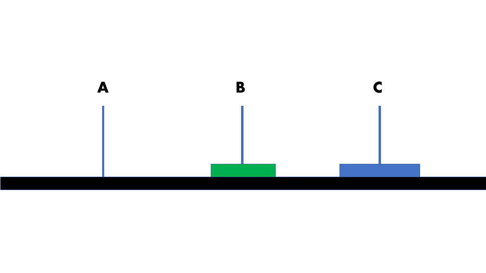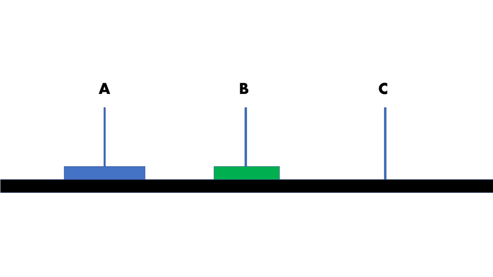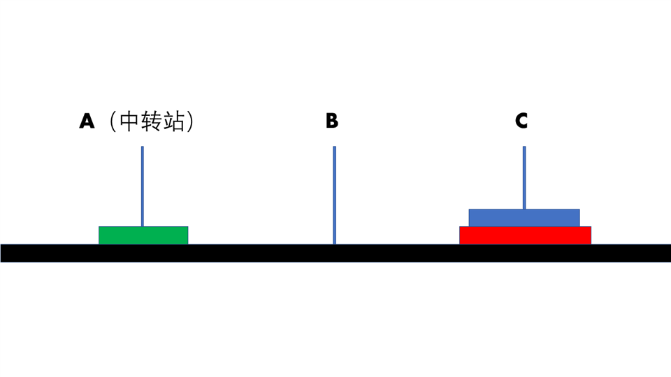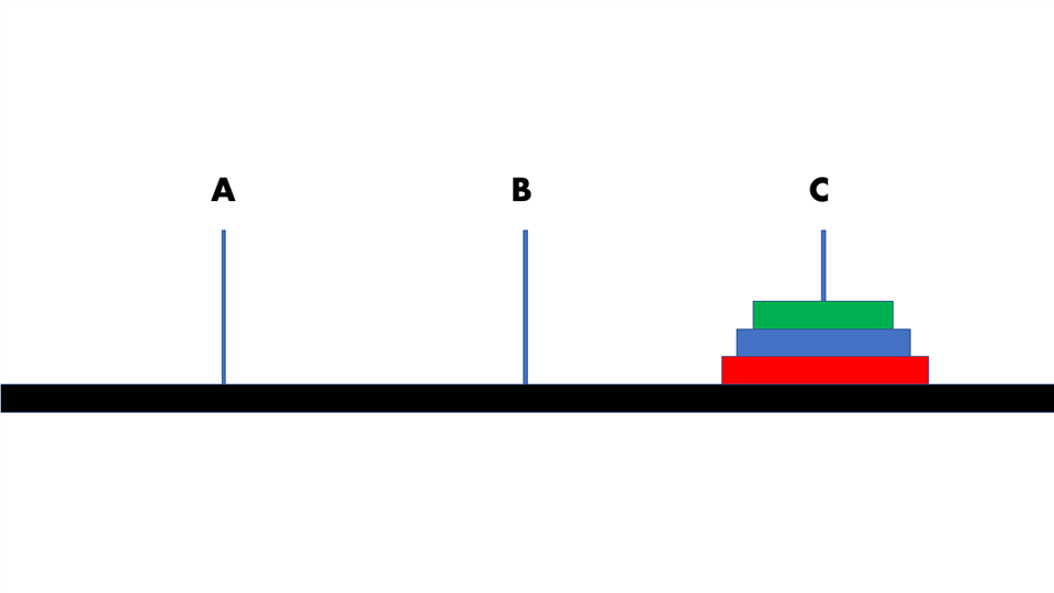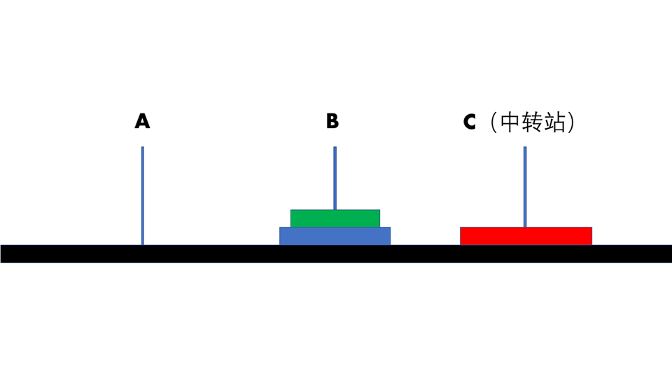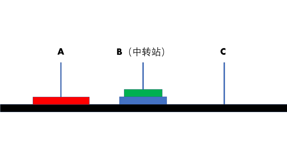 So we can use the way in the situation of two discs to move green and blue to B, and then move the red one to C