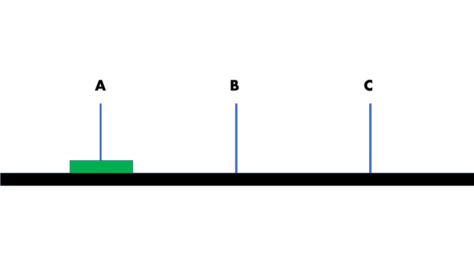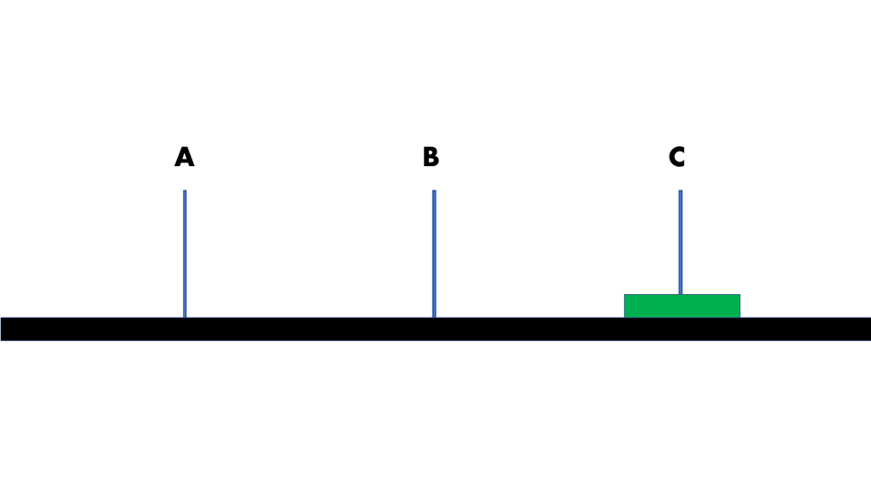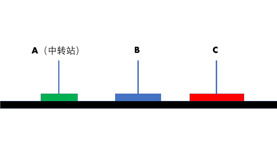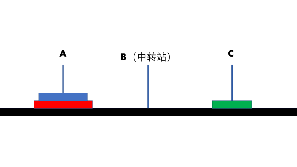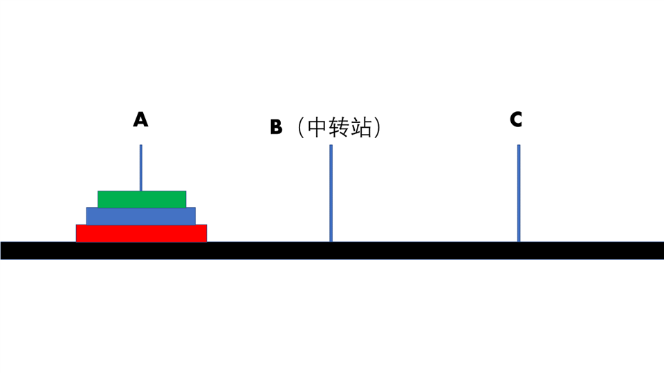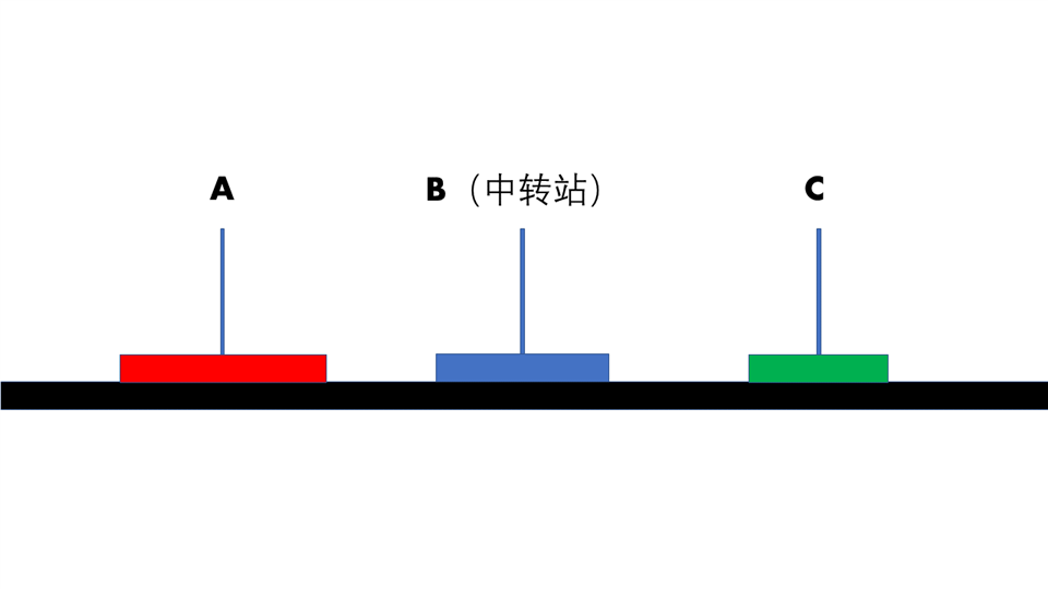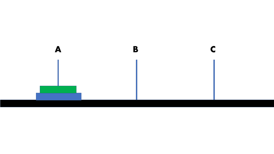 So we can use the way in the situation of two discs to move green and blue to B, and then move the red one to C